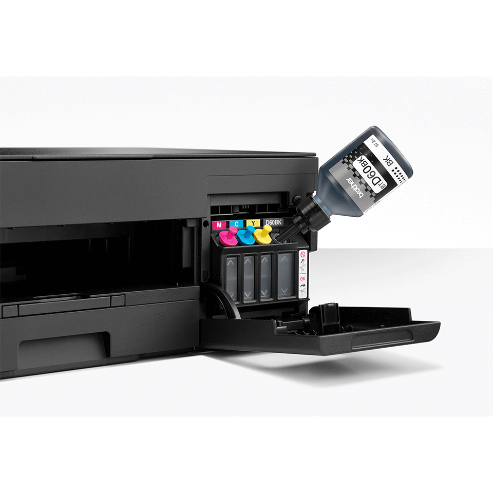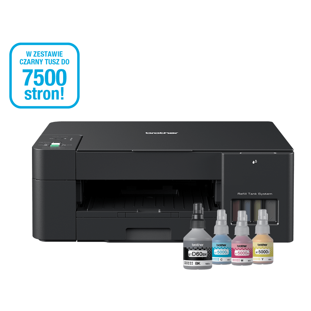 Wraz z urządzeniem DCP-T220 otrzymasz po jednej butelce atramentu koloru: czarnego (wydajność do 7500 stron), cyjan (wydajność do 5000 stron), magenta (wydajność do 5000 stron) i żółtego (wydajność do 5000 stron)*. Usprawni to Twoją pracę i znacznie obniży koszty wydruku.